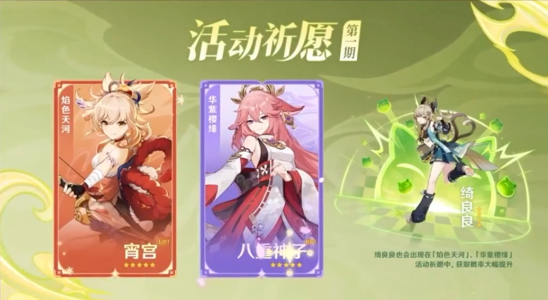 3.7版本第一期卡池:宵宫/八重神子/绮良良